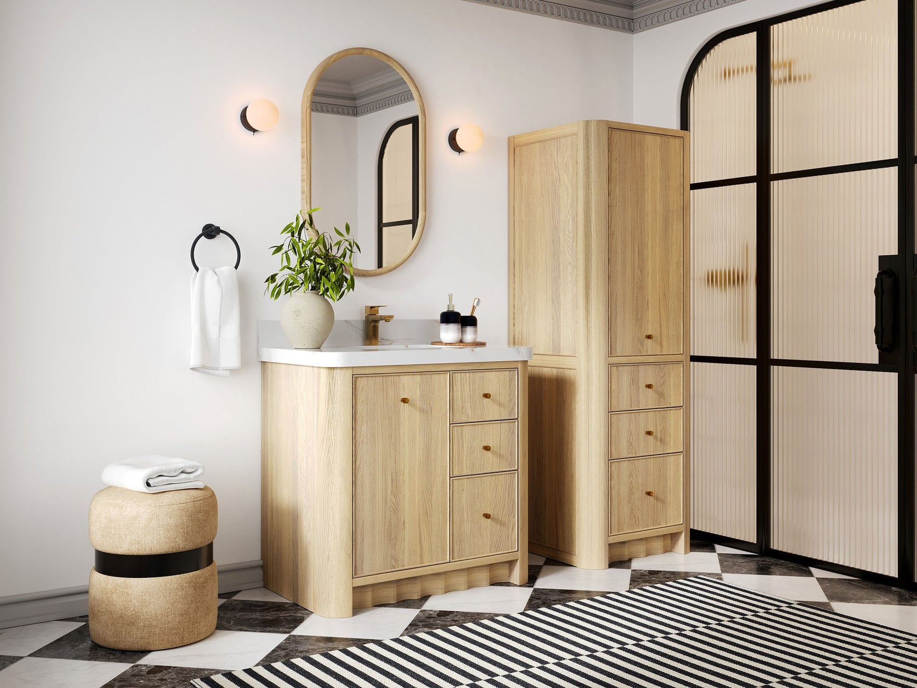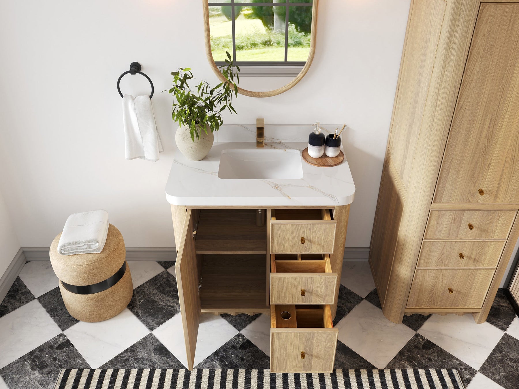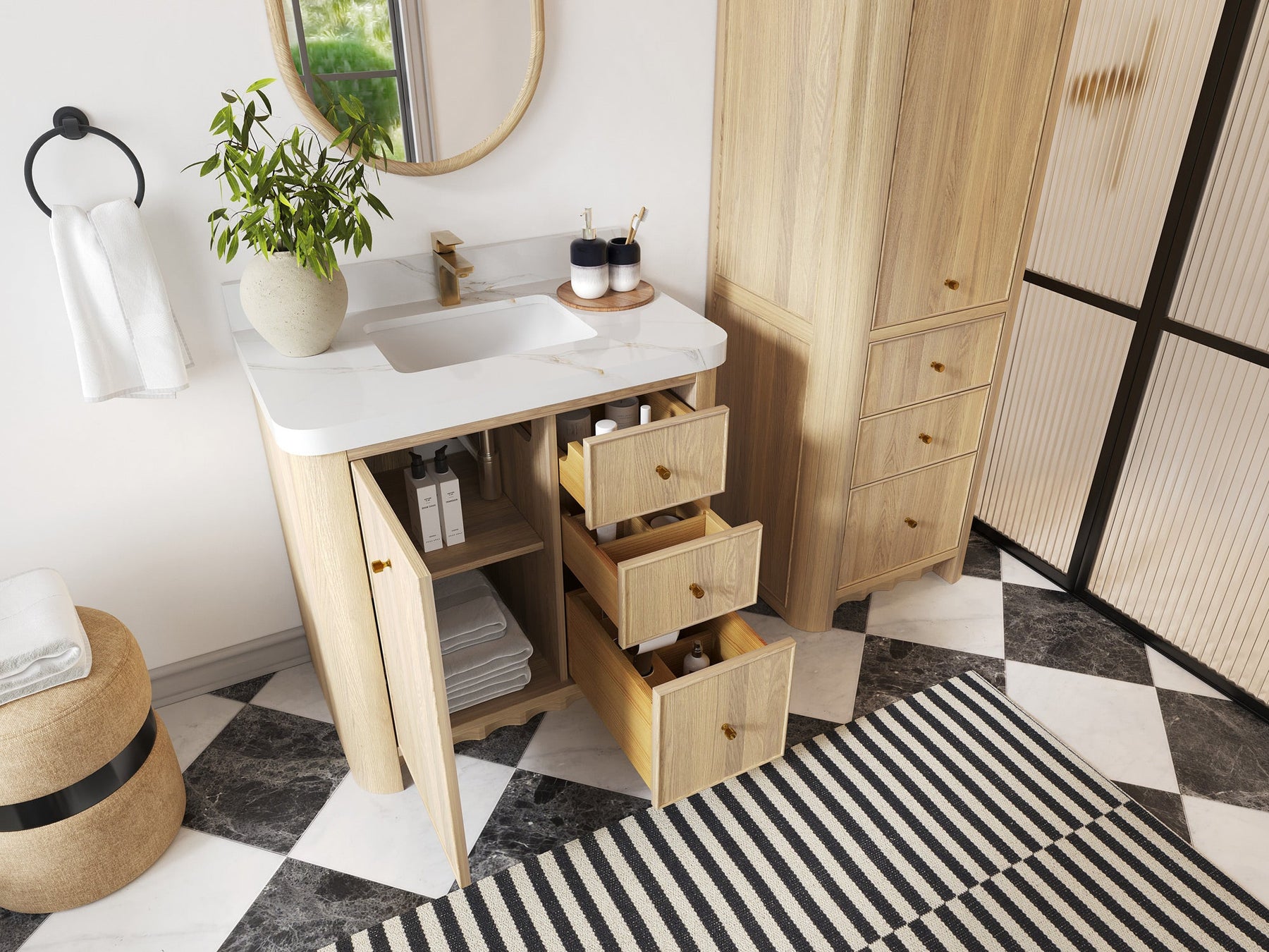 The Orlando Vanity features clean contemporary lines, natural wood-tone interiors, and smooth-glide joinery built for exceptional durability. Its rounded-edge countertop enhances comfort while adding a refined, high-end visual appeal. Gold hardware accents complete the sophisticated aesthetic, making this vanity a true statement piece in any bathroom setting.