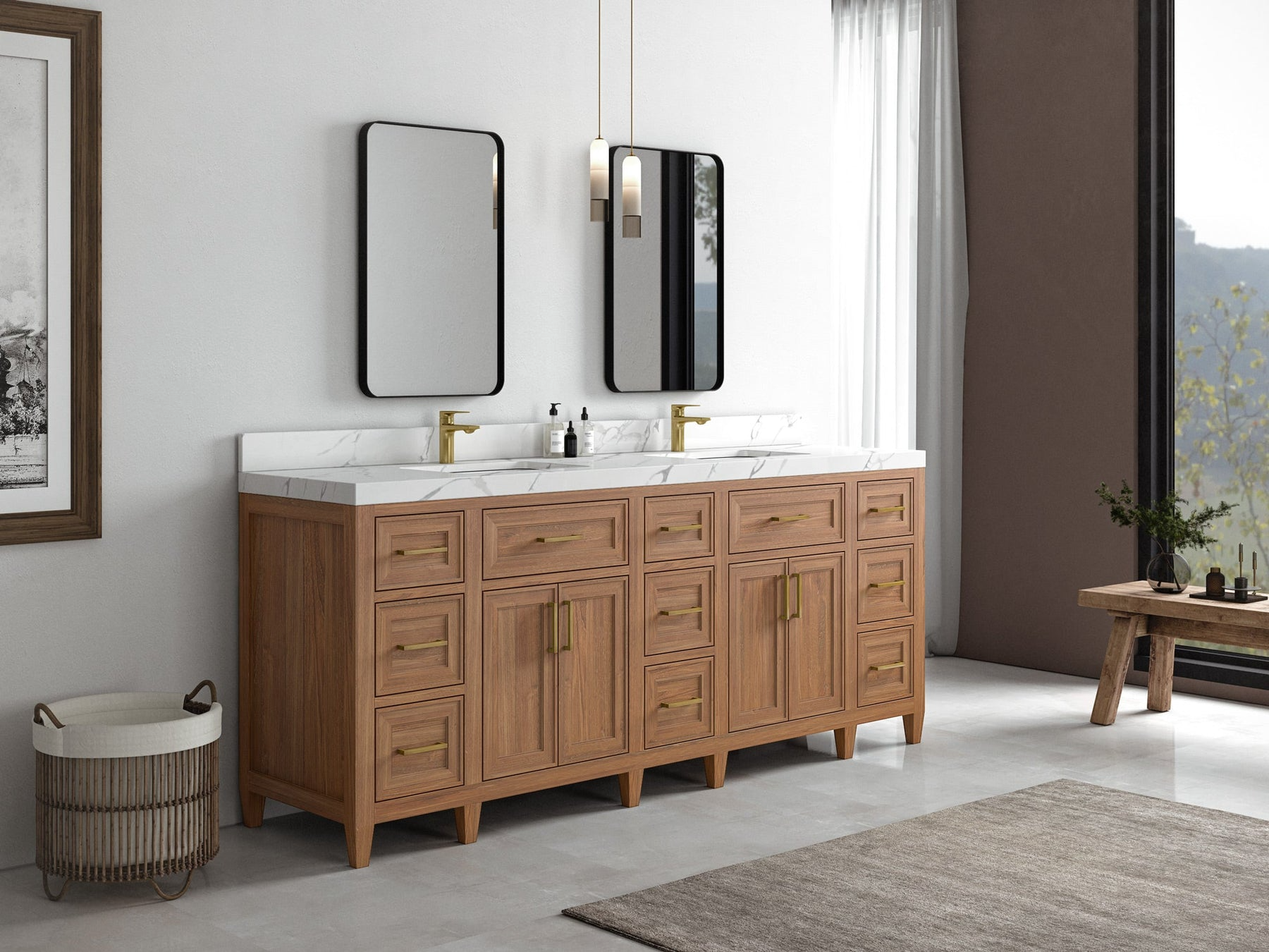 1. Traditional style with a modern twist – made from teak wood, this bathroom vanity features a clean, contemporary design with soft-close hardware and antique brass hardware.
