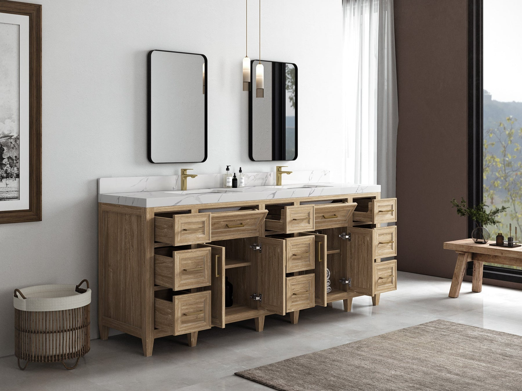 1. Traditional style with a modern twist – made from teak wood, this bathroom vanity features a clean, contemporary design with soft-close hardware and antique brass hardware.